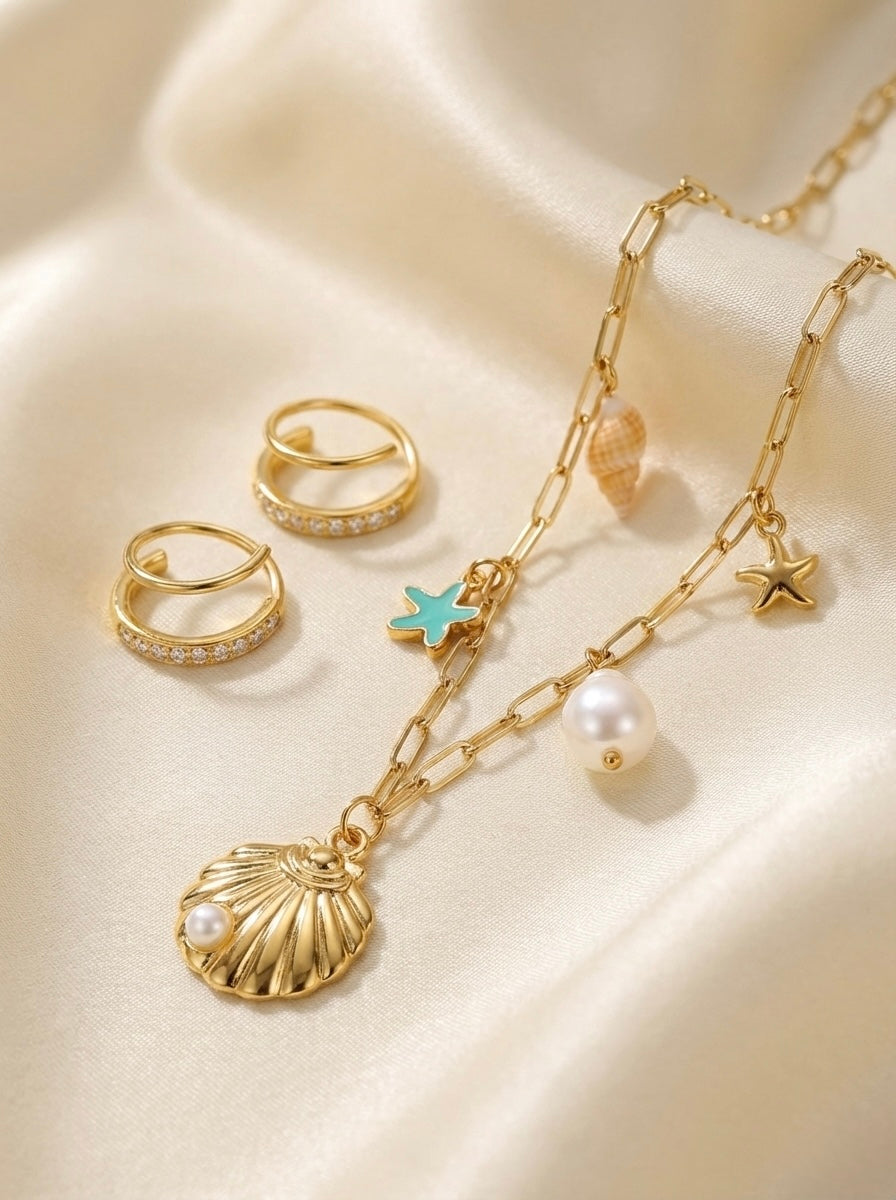 A combination of beach baby necklace and faux double piercing earring for a perfect day out.